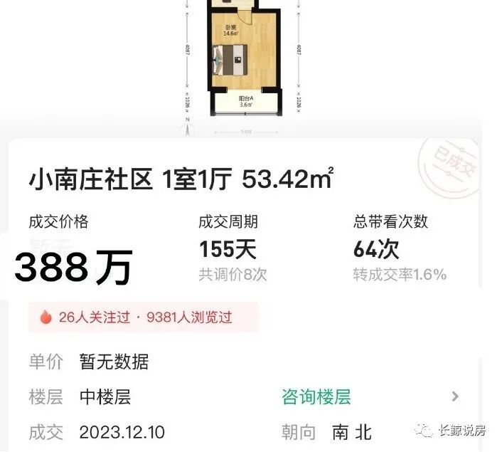 23年12月10日,小南庄社区成交了一套一居室的占坑房,令人惊讶的是成交价只有388万。