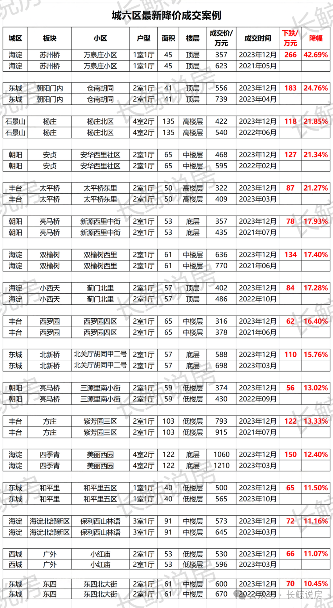 统计了城六区部分成交案例,尤其是降价幅度超过10%的小区。