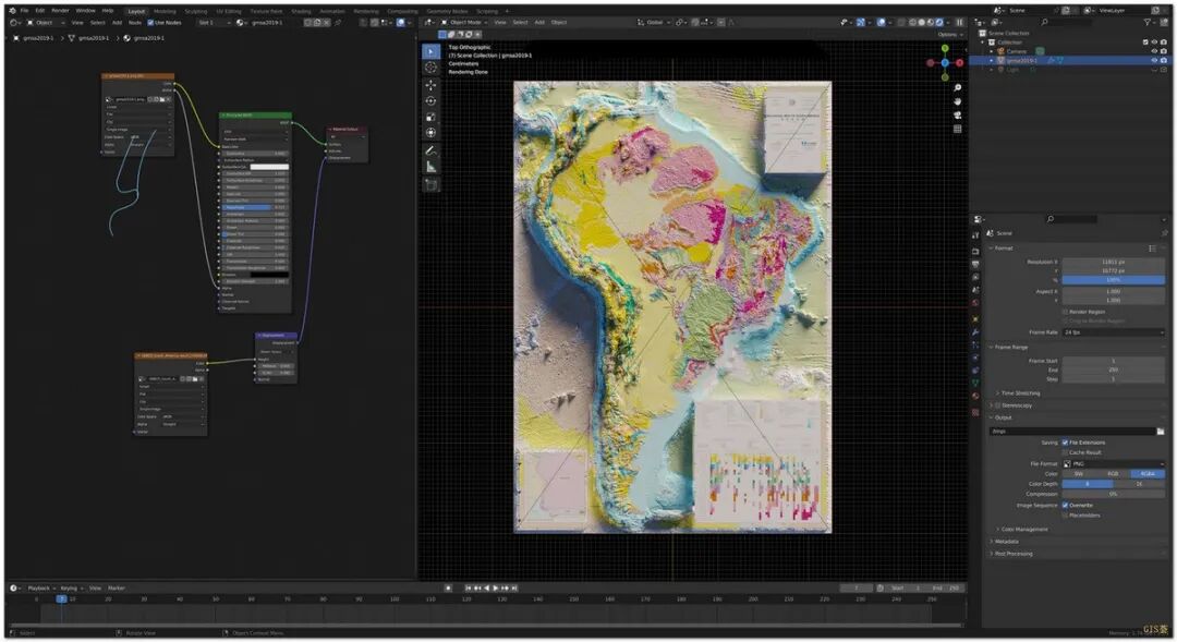 出人意料的是,原作者团队不仅有正常制作导出的地质图,还特意制作了一幅三维效果的地质图,在介绍网页说明是使用 Blender制作的,但是没有提供步骤。
