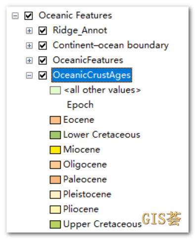 不出意外是透明度图层叠加山体阴影,打开 OceanicCrustAges 图层的属性框,可以看到设置了50%的透明度,毕竟 ArcMap 没有图层混合效果,不像 ArcGIS Pro 和 QGIS。