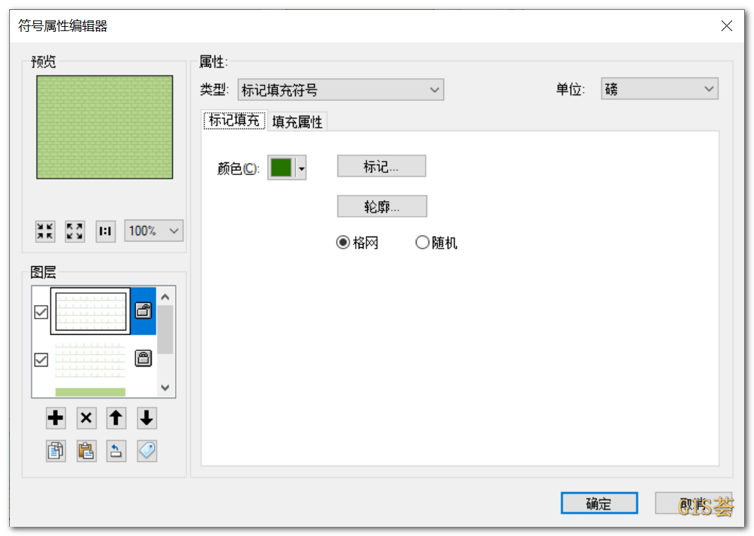 图层 Chronostratigraphic Units 中有大量年代地层图例,比如打开 Ks2 年代地层图例,可以看到该图例是由两个标记填充符号和一个纯色填充合成。