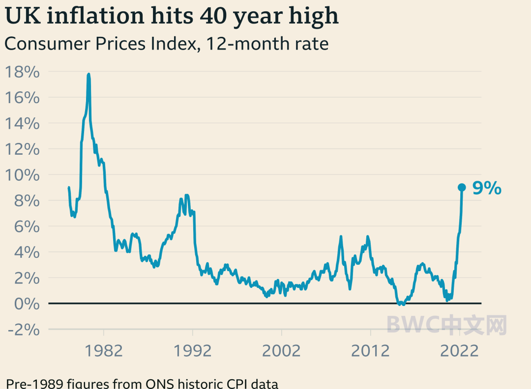 英国国家统计局最新报告显示,英国4月CPI达到 9%,超过了 1990 年代初经济衰退的高位。英国央行行长安德鲁·贝利表示,无法阻止英国今年通胀率触及10%。