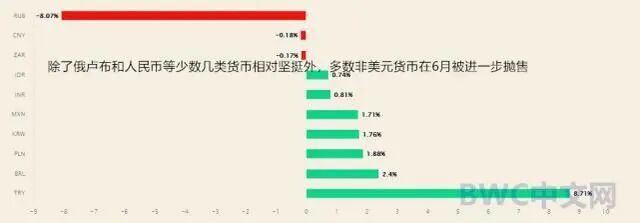 如下图,随着本月稍早前美元刷新近20年高位,除了俄卢布和人民币等少数几类货币相对坚挺外,多数非美元货币在6月被进一步抛售。