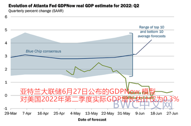 亚特兰大联储6月27日公布的GDPNow最新模型对美国2022年第二季度实际 GDP增长(经季节性调整的年增长率)的估计仅为0.3%。这也成为美国经济陷入衰退的另一个佐证。