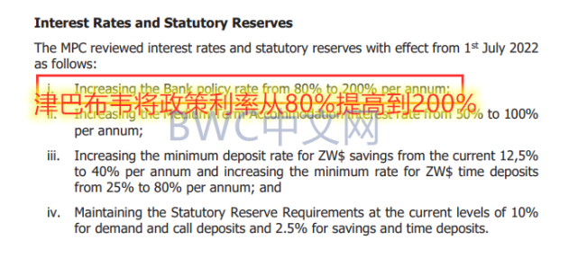 津巴布韦央行6月27日发布声明称,将政策利率从80%提高到200%,加息幅度达到12,000个基点。今年该行的累计加息幅度达到了14,000个基点,为全球之最。同时,津巴布韦央行正式将美元重新引入作为法定货币,以平抑三位数的通胀以及稳定不断下跌的汇率。