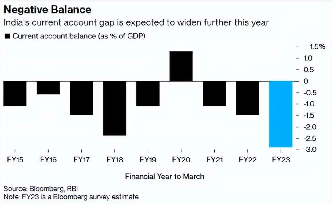 彭博社最新调查显示,在截至2023年3月31日的财政年度中,印度经常账户赤字占国内生产总值(GDP)的比重可能会扩大到2.9%,这一数字将是前一年水平的两倍。