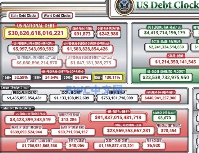 美媒Zerohedge在8月7日援引的数据显示,如果美国联邦债务在2022年底达到33万亿美元,利率提高到接近历史正常水平4%(预计到年底会升高至3.95%),那将意味着美国联邦在接下去的两年内每年为此支付的债务利息将达到1.32万亿美元,债务负担将在2023年达到GDP的135%(美国国会预算办公室报告)。