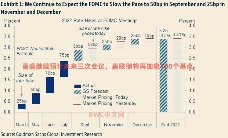虽然,华尔街目前预测7月CPI增速将从此前的40年高位9.1%降至8.9%,但美国在上周公布的7月非农就业数据增长意外加速,可能使美联储继续大幅加息,降低了对美联储在2023年第一季度降息的押注,甚至,市场还出现了9月22日美联储利率会议前再临时加息一次的传言,正如下图所示,美联储加息预期激升。