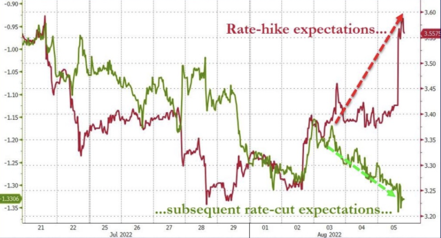虽然,华尔街目前预测7月CPI增速将从此前的40年高位9.1%降至8.9%,但美国在上周公布的7月非农就业数据增长意外加速,可能使美联储继续大幅加息,降低了对美联储在2023年第一季度降息的押注,甚至,市场还出现了9月22日美联储利率会议前再临时加息一次的传言,正如下图所示,美联储加息预期激升。