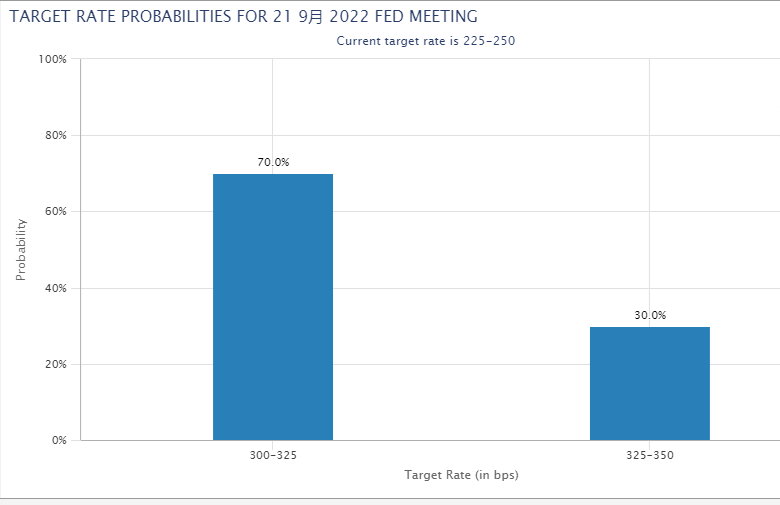 根据芝商所“美联储观察”工具9月15日的预期展望,美联储下周加息100基点的概率已经升至了30%。9月15日,芝商所美联储观察工具预计美联储下周加息100个基点的概率为30%,尽管比9月14日的32%有所回落,但交易员表示,依然不能够掉以轻心。有分析师认为,至少美联储本轮加息周期将持续至2023年年底,最终美国市场的基准利率可能会达到4.5%左右的水平。