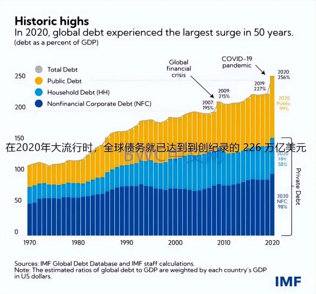 根据IMF(国际货币基金组织)的数据,自2007年全球范围内的政府、公司和家庭的债务占全球 GDP 的 195% ,而到2020年底,这一比例已达到 256%。这些债务堆积如山更难以承受,因为利率正在上升以抑制通货膨胀,大流行和能源危机阻碍了增长,投资者更不愿冒险。这导致自2022年以来欧洲以及一些脆弱市场上演了经济,债务和货币困境。
