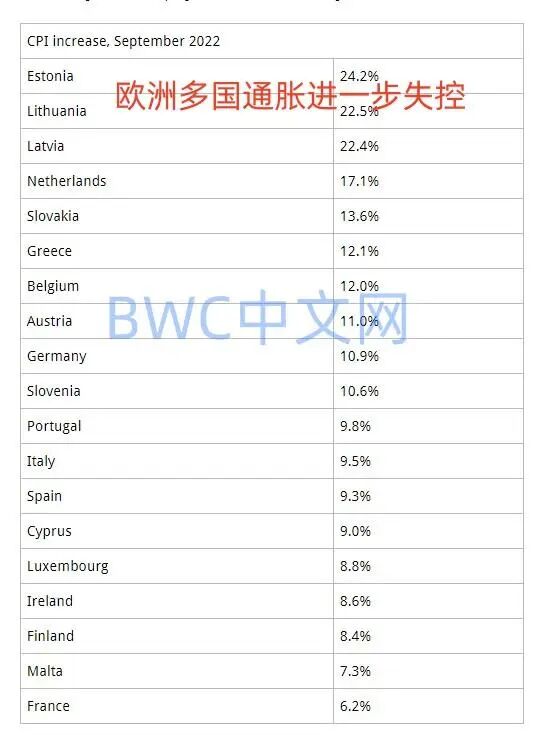 其中,德国的通胀率从 8 月份的 8.8% 飙升至 10.9%。欧元区 19 个国家中有 9 个国家通货膨胀率超过 10%,包括三个波罗的海国家,通货膨胀率超过 22%。这进一步表明,欧洲多国经济似乎正在随着廉价货币时代即将终结,而付出代价。