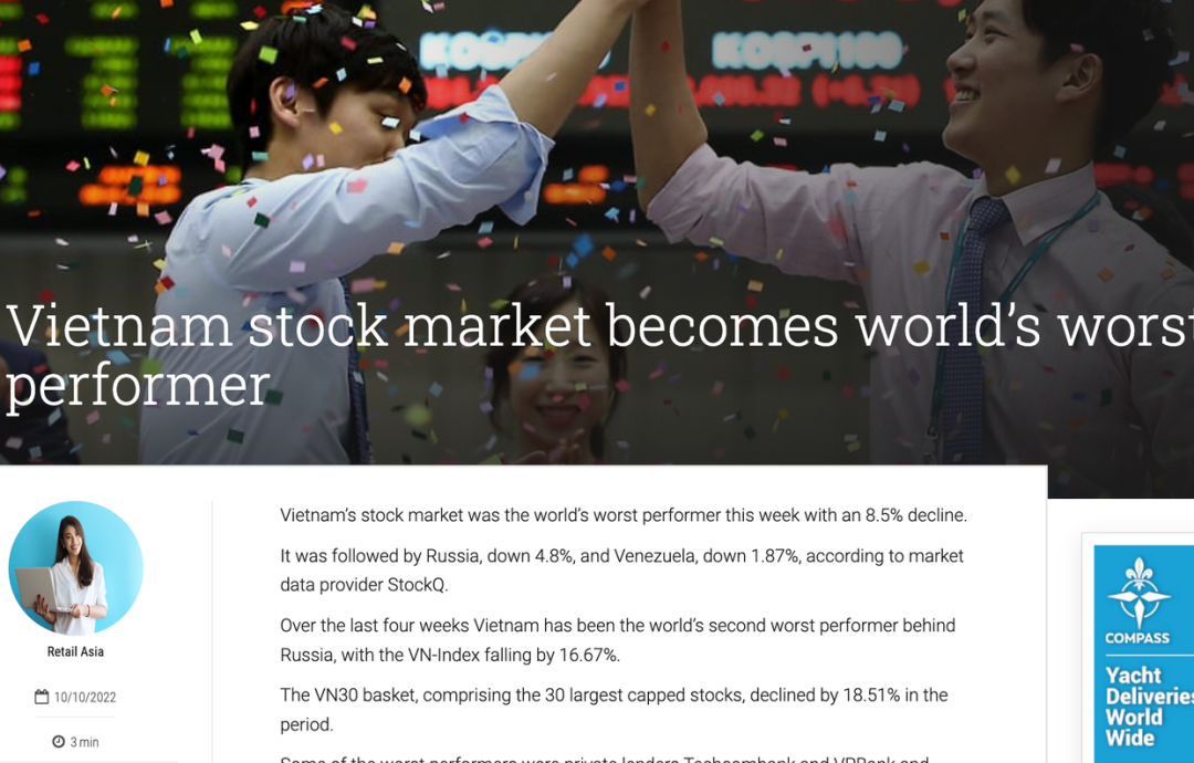 10月17日,越南证交所指数收跌0.97%,报1051.58点,越南胡志明证交所/VN 30指数收跌1.34%,在过去的四周,越南VN指数下跌了17.92%,而自2022年以来,越南股市的估值更是跌至十来年的低点,因投资者回避股票并寻求风险较低的资产避险。