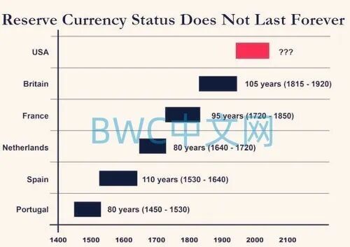 正如下图所示,自15世纪至20世纪前二十年的500多年间,葡萄牙,西班牙,荷兰,法国,英国的货币都分别在某个特定的历史阶段充当过全球贸易的主要货币,而后却都被替代了。