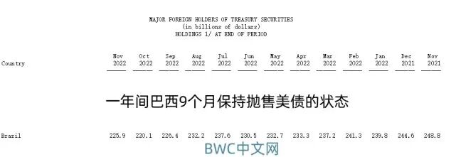 而通过下图,美国财政部1月18日公布的最新一期国际资本流动报告(该数据延后两个月惯例)显示,作为美债第9大持有国的巴西,自2021年12月至2022年11月的一年,9个月保持抛售美债的状态,累计净抛售229亿美元的美国国债,累计净抛售比例近10%。
