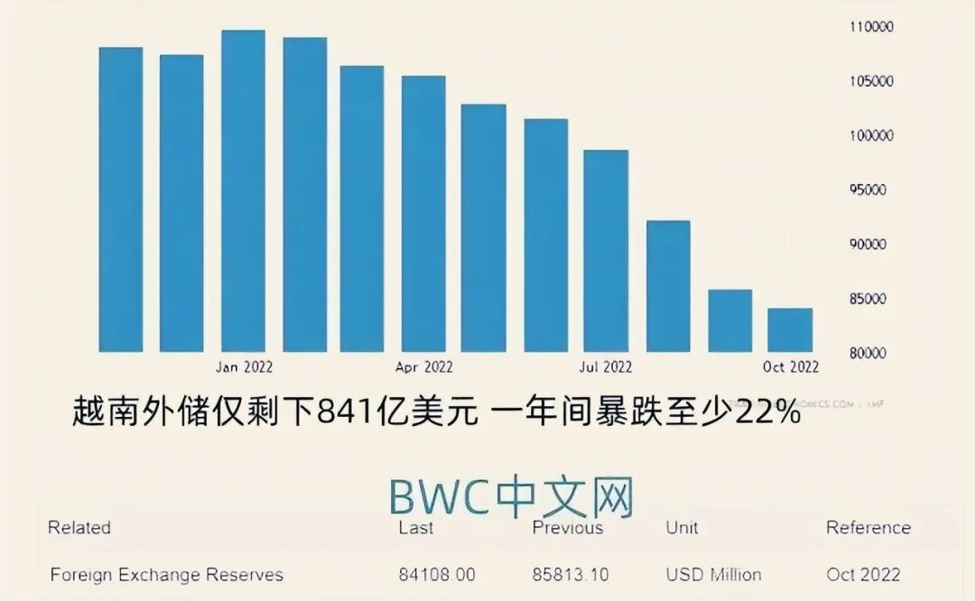 数据显示,过去一年,越南的外汇储备急跌。据国际货币基金组织的报告,仅截至去年10月,越南外储仅剩下841亿美元,从2021年的1074亿美元暴跌了233亿美元,暴跌至少22%。而在这一过程中,2022年越南出口额达到3718.5亿美元,增长10.6%。