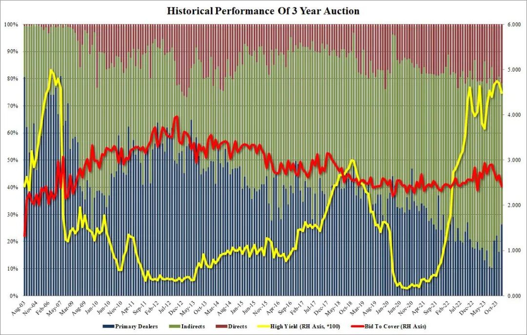 高盛在12月10日发布的一份报告中写道,2024年初,美国联邦关门的风险可能会更高,美国债务上限闹剧将重演,并表示他们正在密切关注外国央行是否会背离美元或持续清算美债,这也使得12月12日美国财政部进行总额为350亿美元的 3 年期拍卖显示外国需求降至 2022 年 6 月以来的最低水平。