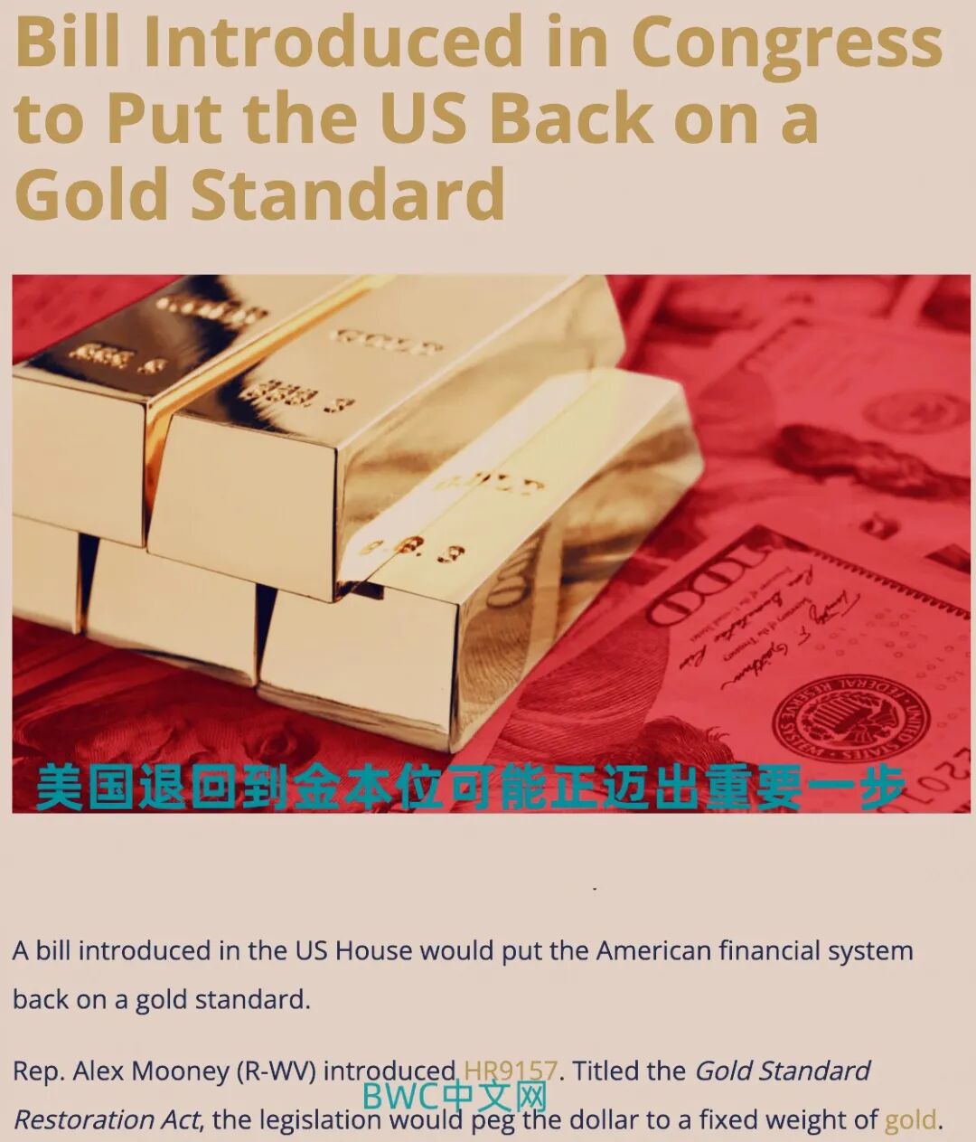 美国金本位制的捍卫者,国会议员亚历克斯·穆尼(Alex Mooney)在12月10日第八次大胆地向国会提交的HR4095提案中,敦促回归以黄金为基础的金本位制度的货币标准将有助于恢复美元的价值和地位,金本位将防止美国不负责任的消费习惯和凭空创造美元,以挽回美联储和美国财政部主导的美元对目前稳健货币系统造成损害后的信誉损失。