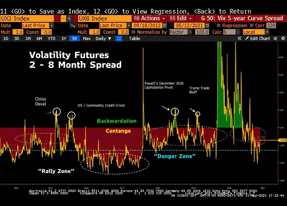 美银一周前对数十位基金经理的调查结果显示,93%的基金经理认为在接下去的12个月内美国的通胀水平将加快上行,并预计利率将上涨,使得美股将出现两位数的回调,正如下图数据所示,美国市场中的21个雷曼兄弟风险指标正在闪烁,第二个月和第八个月波动率期货合约之间的价差是三月份以来最高的。