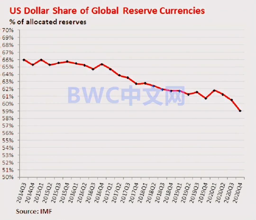 而据IMF数据,美元份额在2020年度意外下降至25年来最低至59%,请注意,2000年时该比例曾高达73%。显然,通过下图,可以看出美元储备地位下降已经成为趋势。