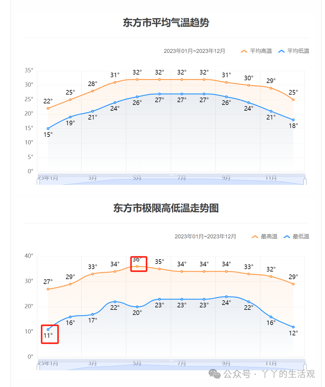 自2023-01-01到2023-12-31,东方历史气温共出现: