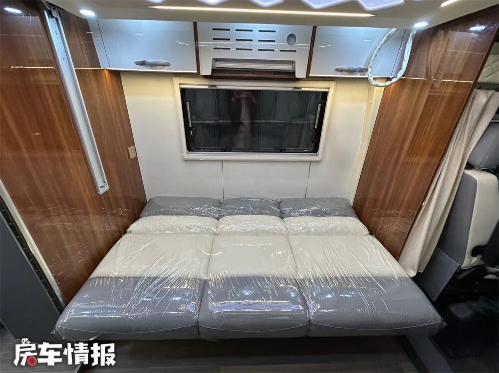 车内的生活区整体就是浅色系的装饰,双人卡座搭配可折叠的餐桌以及长条形的沙发座椅也能在休息时翻折成一张可以容纳一人休息的沙发床。上方还有家用变频空调可以调节车内温度,以及储物柜用于存放行李物品。正上方还有一张可容纳两个成年人休息的电动升降床在夜间休息时放下来可以舒适的躺在上面休息。