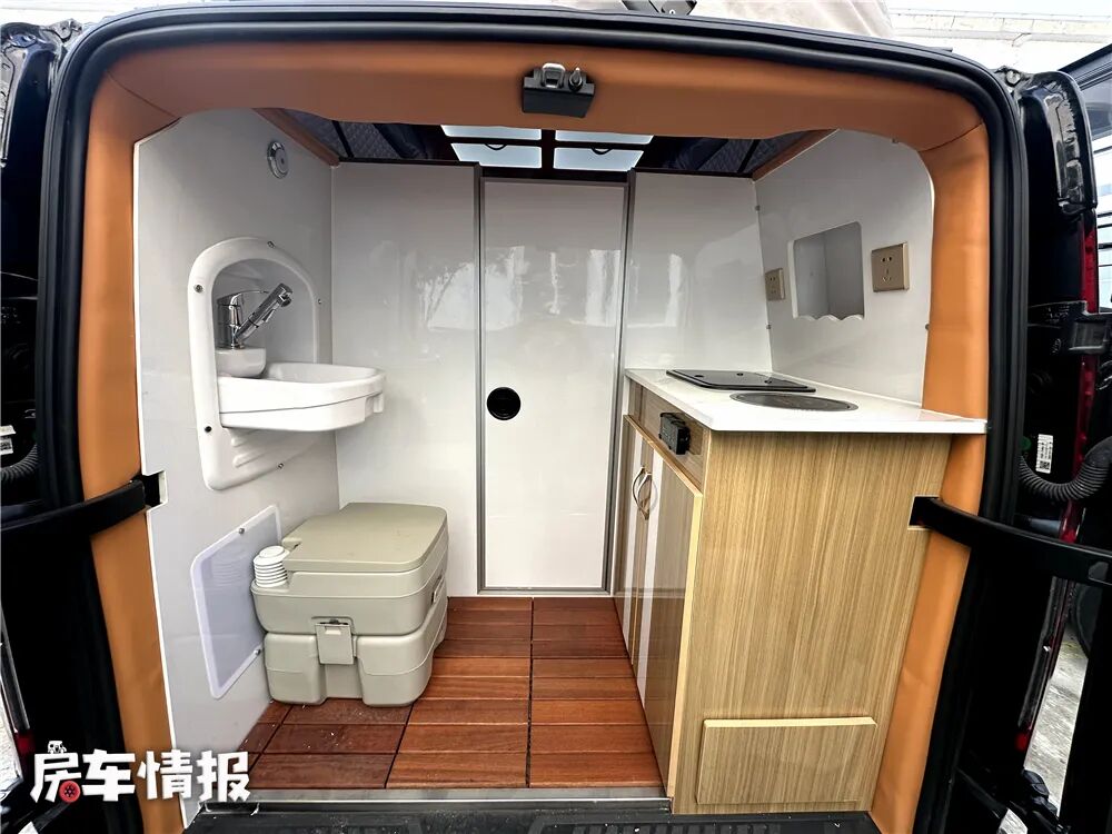 来到车身尾部,这里还提供了后置的厨卫系统,或许知道很多人不喜欢厨房和厕所在一起,厂家特意安排了便携式马桶,如果只是想把这里作为厨房使用的时候,就不会产生阴影了,厨房的话提供了电磁炉、洗菜池、冰箱等基础设备,另一侧提供了可翻折洗手池,简单淋浴洗漱也没问题。