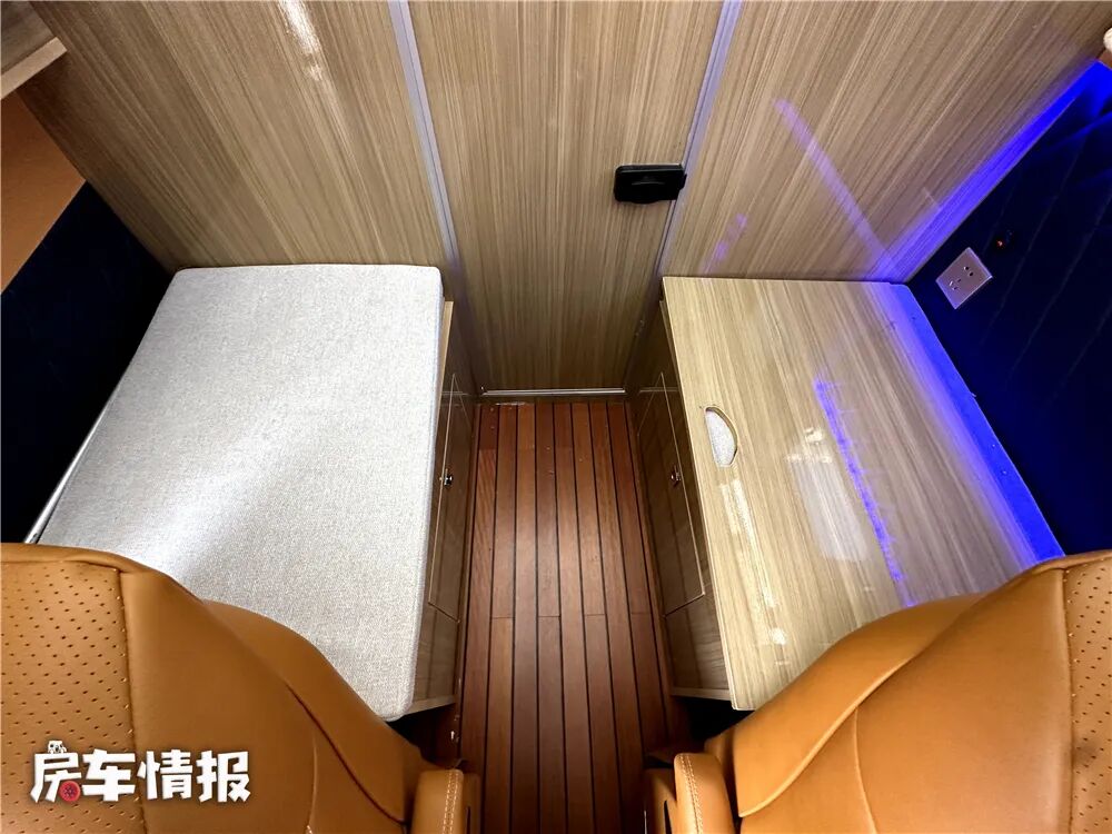 航空座椅后方,则是一组小型沙发,这里既可以当作用餐区使用,也可以拼成一张小尺寸的单人床,临时休息使用,到了夜晚想要更好休息的话,车顶升起来以后,内部还提供了一张双人床,睡下两名成年人完全没问题。
