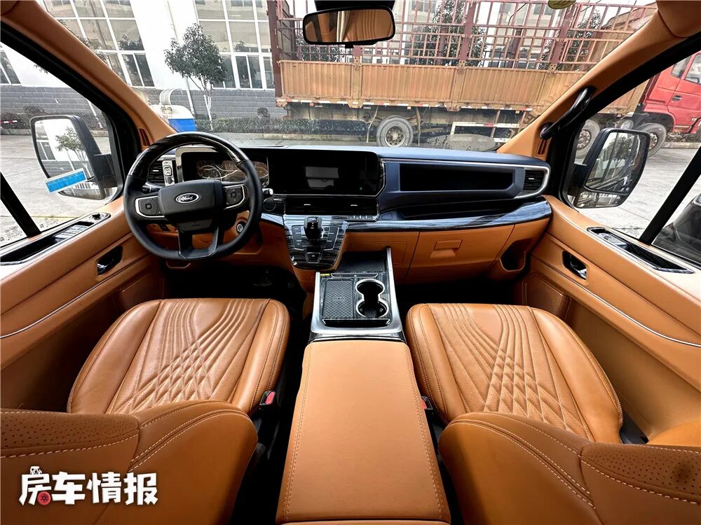 驾驶室内部也进行了商务风的升级,与生活区同配色的皮质包覆看起来比较显档次,福特全顺V363的双屏幕看起来也比较有科技感。
