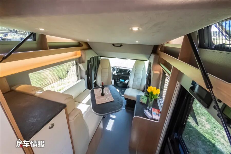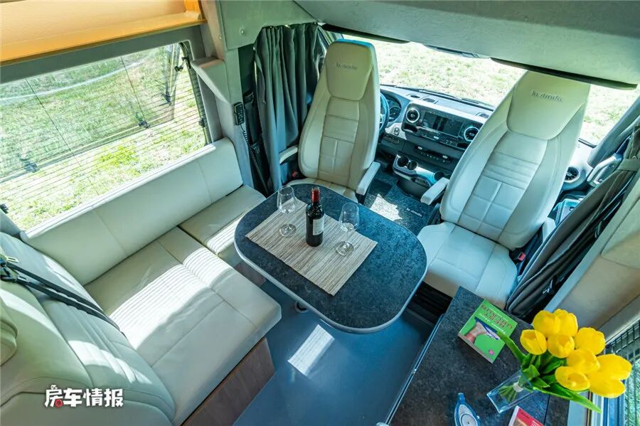 进入车厢内部,这款车给我的惊喜同样不小。首先是车厢前部,采用的L型沙发座椅布局,搭配可向后旋转的主副驾驶座椅,能够在车厢前部形成一个标准的会客区吃饭聊天完全没有问题。