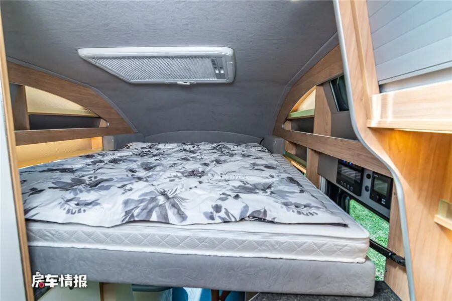 除此之外,在会客区顶部还有一张可升降的双人床,尺寸更是达到了2050*1400mm,标准的双人床,能够睡下2名成年人,此车基本上可以满足3个成年人或者2大2小的四口之间住宿。