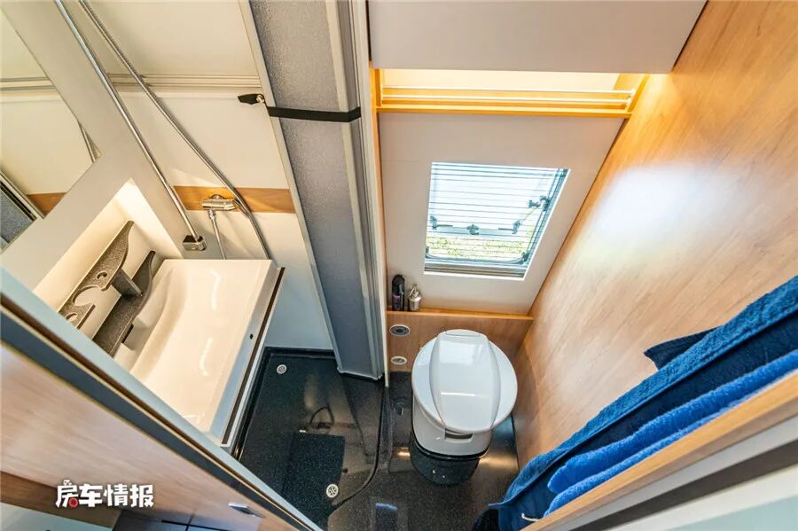 车内卫生间同样位于车厢中部,可贵的是卫生间采用干湿分离设计,且内部空间非常大,就算是内外空间同时2人使用也完全没有问题。