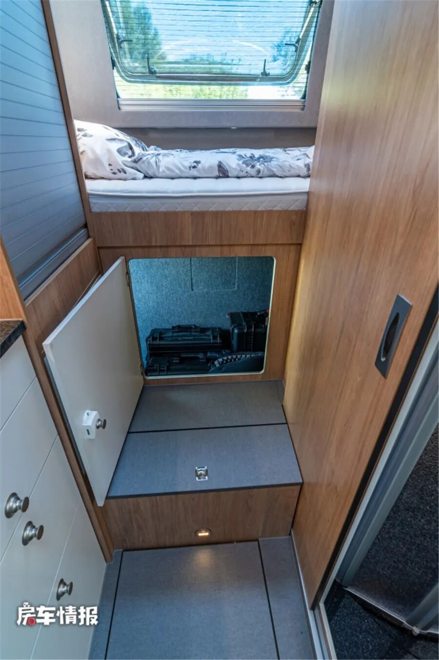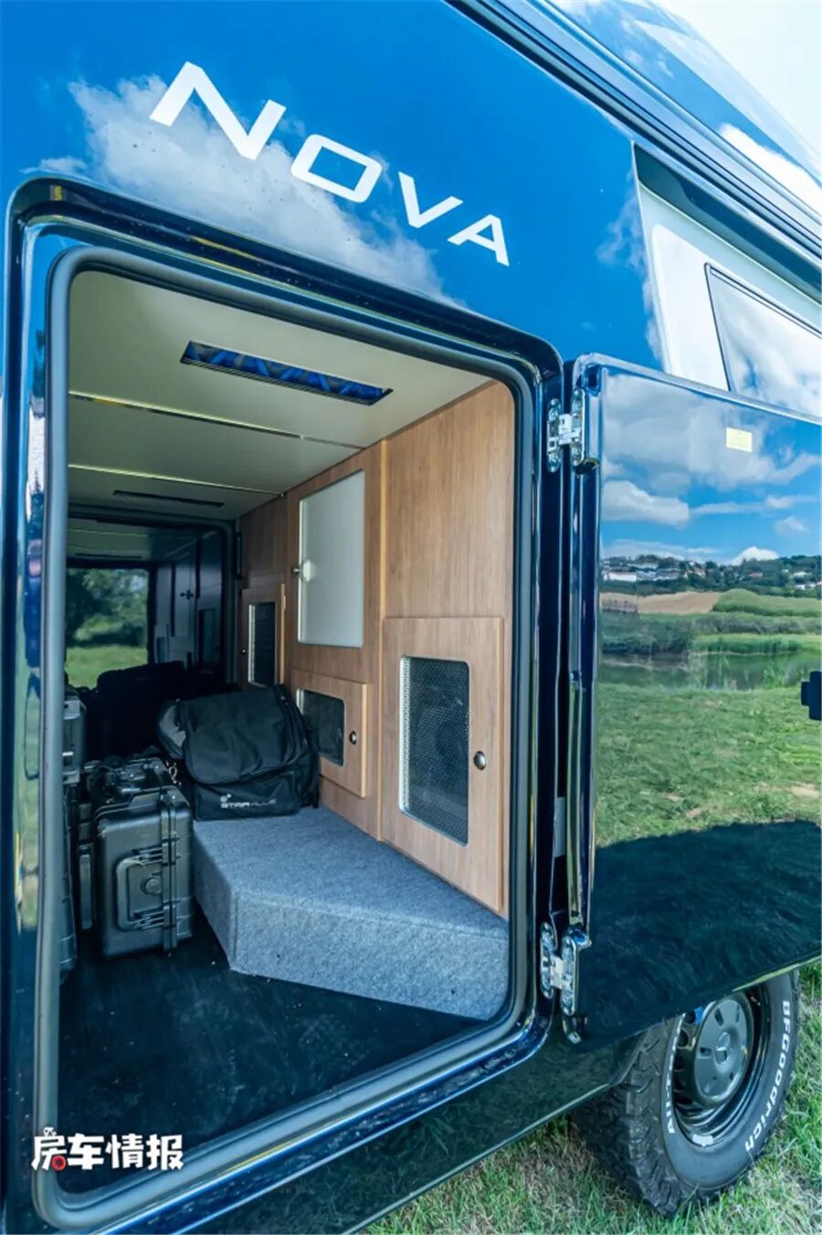 车身外部提供了一些常规的房车生活设备,位于车厢尾部提供了一个尺寸巨大的贯通式行李箱,能够存放下旅行中必要的行李和物资,如果愿意的话,也可以存放下一辆单车或者小尺寸摩托车。车厢侧面还提供了遮阳棚,以便在驻车以后在车外搭建一个休息区。