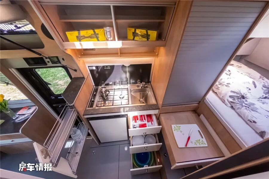 而车上的厨房区域则位于车厢中部,提供了燃气灶、80L房车专用冰箱、洗菜池等,基本上能够满足日常使用,对了,这种进口车型是不配备外置燃气灶的,个人建议大家可以自备一套户外卡式炉。