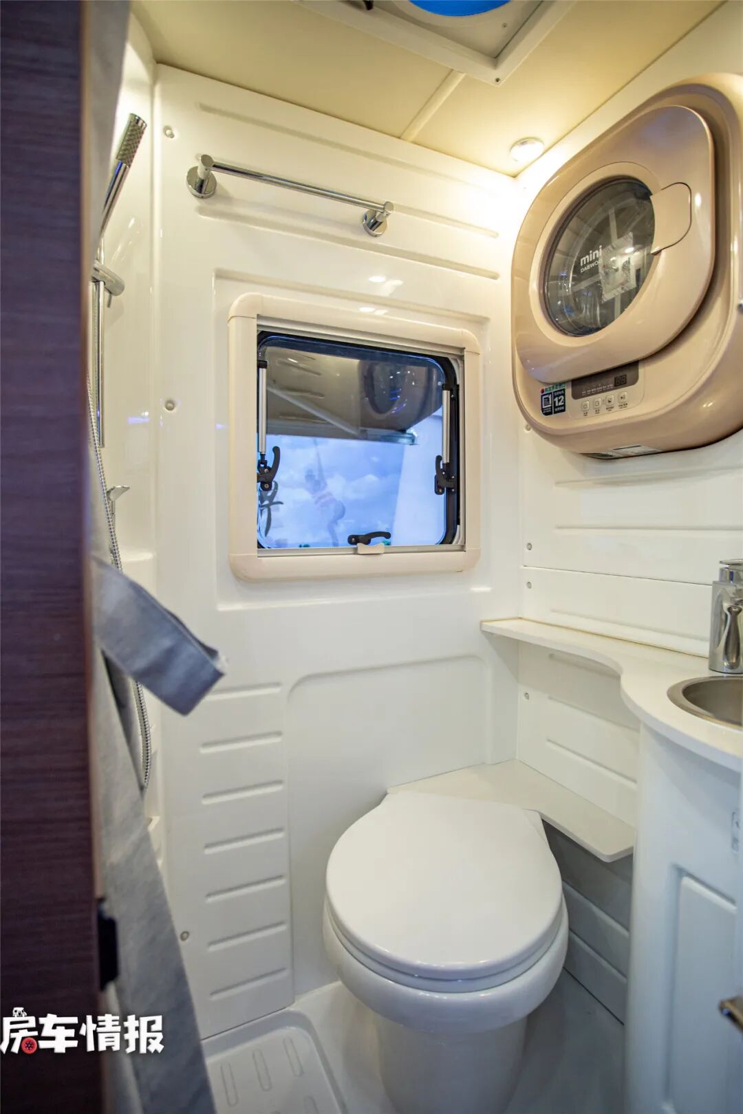 车内卫生间空间依然不小,细节处理的也很细腻,提供了独立水盆、浴室镜、淋浴花洒、电动粉碎式马桶等等,日常使用完全没有问题。