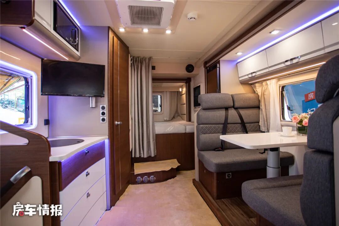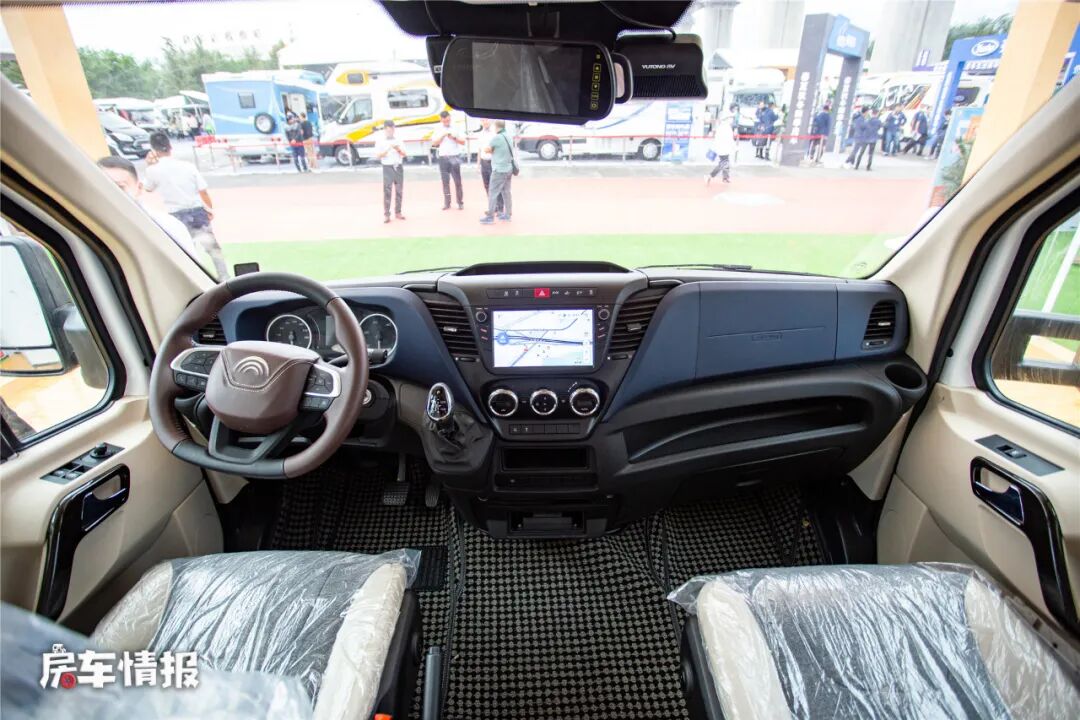 最后来看一看这款新车的内部,毕竟房车的内饰也是非常重要的。这款新车采用双拓展设计,位于车身左侧和尾部分别有一个拓展舱,这样的布局方式也比较常见,也因此车内空间非常充裕。车内的整体布局和设计与宇通房车自家的进口依维柯NEW DAILY保持一致。