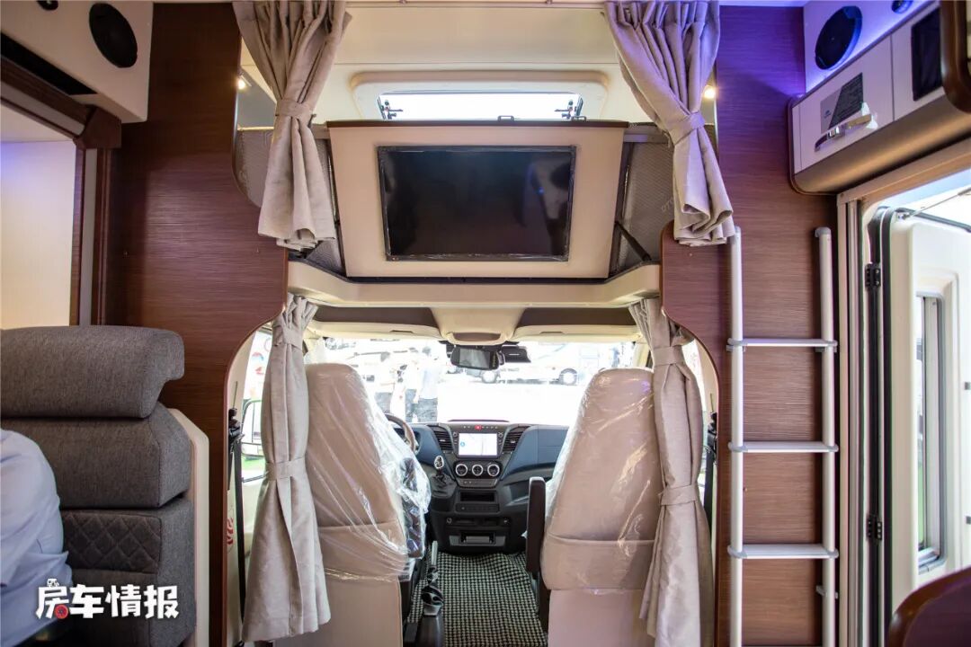 驾驶室顶部依然是额头床,尺寸足够大,能够轻松满足2名成人休息;将床板向上推起则是一台尺寸挺大的液晶电视。