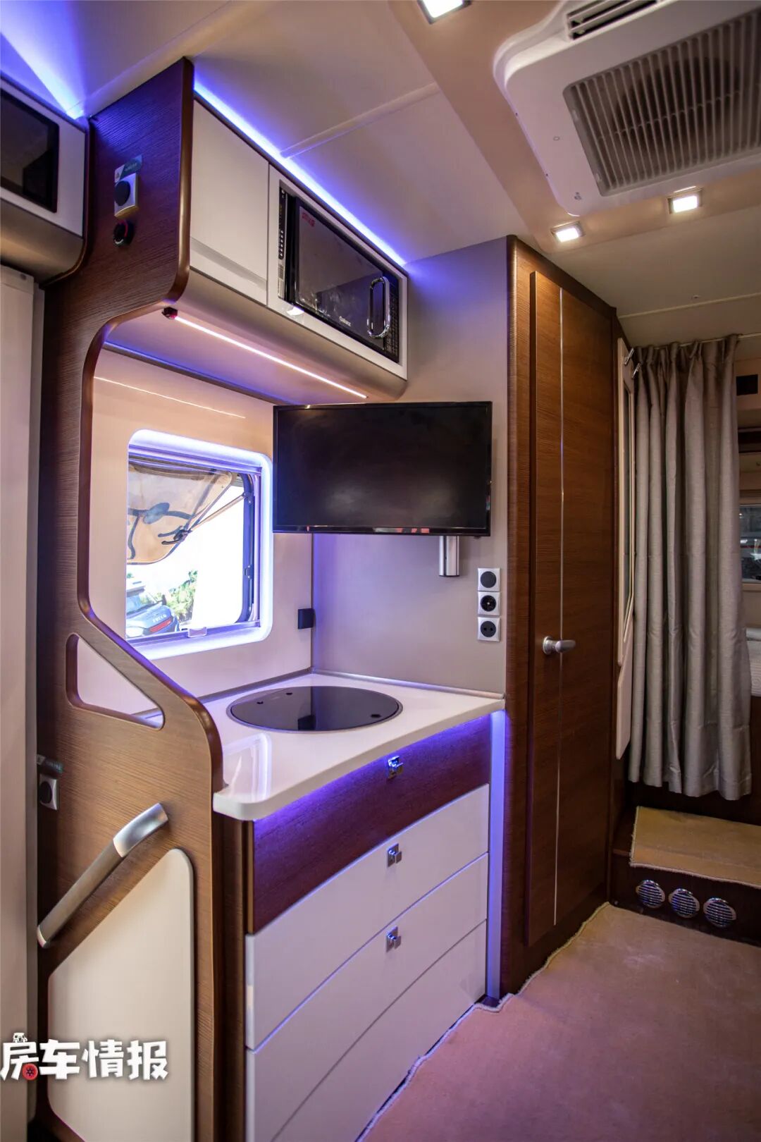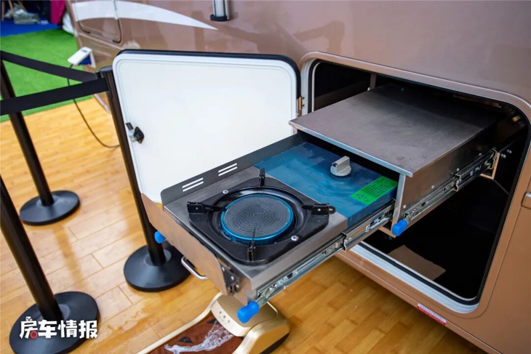 而车厢另一侧的厨房区域,依然是提供了比较齐全的设备,当然啦,日常煎炒烹炸还是建议大家使用车外配备的抽拉燃气灶,以保证车内不被油烟弄脏。