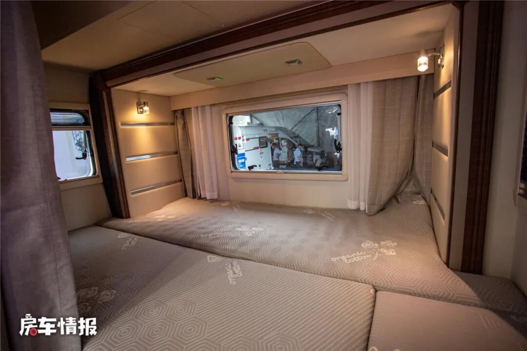 车厢尾部依然是一张依托拓展舱构成的双人床,横向、纵向以及垂直空间表现都很出色,2名成年人使用完全没有问题。