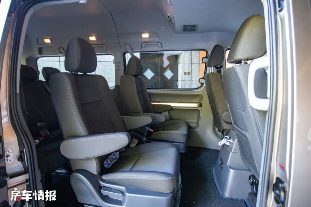 新车提供了城运王和商务王两大系列,所提供的座位数也从2座-10座不等,实拍的7座商务王,采用2+2+3的座椅布局方式,当满载7人的时候,车内空间依然很不错,尤其是后备箱空间依然表现出色,能够装载更多货物,比起常规的MPV车型在空间上有着明显优势。经我们实测,车内总宽度1700mm、高度1620mm、长度2700mm(主副驾驶座椅靠背到车尾门长度),打造成一个小型露营车还是没有问题的。