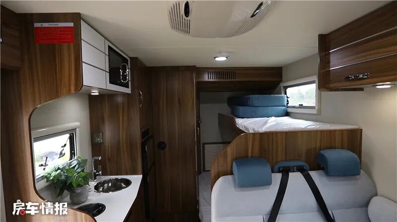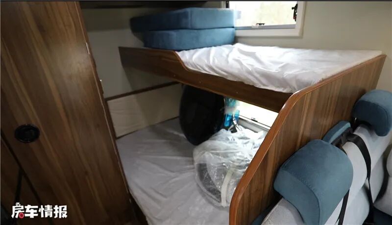 车尾左侧便是子母床了,下床可以睡下两名成年人,上床可以睡下一名成年人,不使用时还可以放置物品,顶部还装有储物吊柜和空调出风口,为车内的睡眠提供了更舒适的环境。