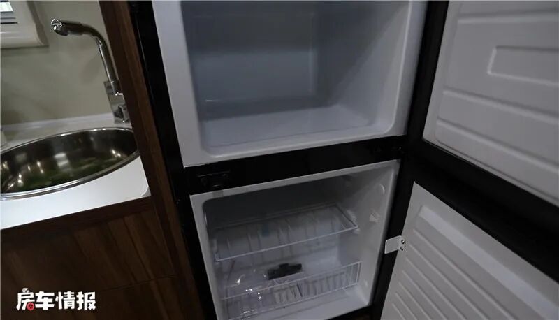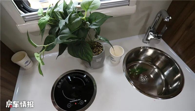 厨房在车门左侧,虽然操作台的空间不是很大,但是设备齐全,装有900W电磁炉、不锈钢水盆、水龙头、微波炉、85L房车冰箱、220V电源插座以及储物柜,操作台顶部还贴心的安装了一个小顶灯,防止切菜时看不清。