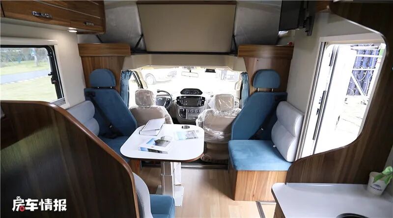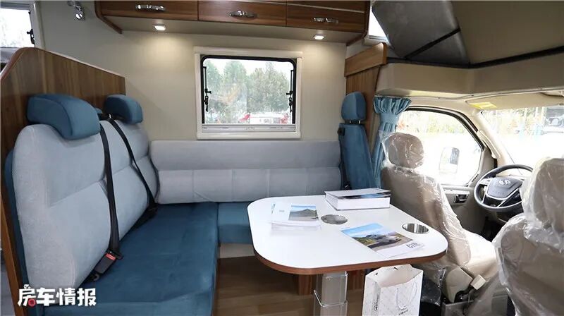 会客区由一个L型卡座沙发、一个单独的座椅以及可升降餐桌组成,采用蓝白色布艺装饰,看上去简单又美观,同时还可以将副驾驶座椅旋转过来,扩大会客区面积。沙发上还有两个带有安全带的座位,行车时保护了家人的安全。左侧顶部有储物吊柜,可以存放出行时的物品,右侧有一台24寸的可移动电视机,方便大家在车内的不同区域观看。当车内的床不够使用时,还可以将会客区组成一张单人床,由于沙发垫的充实柔软,躺上去也很舒服。