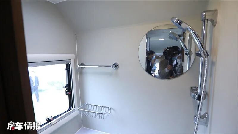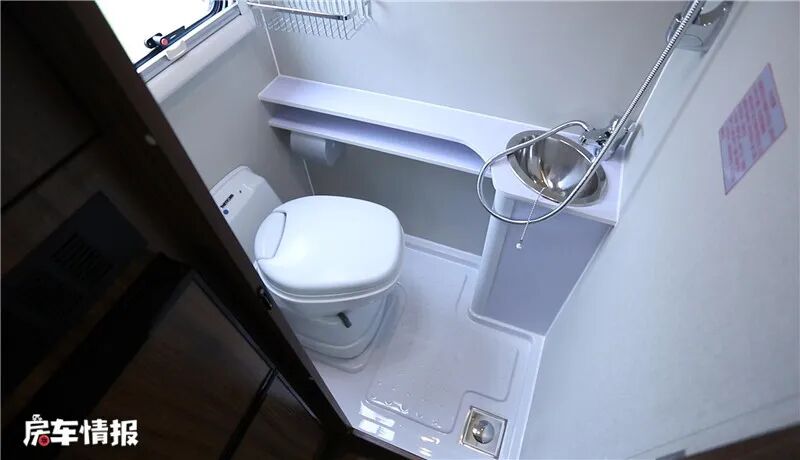 卫生间在车尾部右侧,空间虽然不是很宽裕,但是一个成年人在里面也可以随意走动,设施是十分完善的,装有便携式马桶、淋浴花洒、毛巾架、置物架、不锈钢水盆、化妆镜、换气扇等物品,从户外回来可以在车内洗个舒服的热水澡。