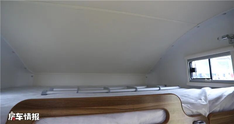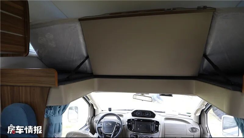 得益于本车大额头设计,额头床的空间很大,躺下两个成年人是没有问题的,顶部还装有一个超大的曲面窗户,通风透气性良好,夜晚还可以躺在这里看星星,两侧还有阅读灯和小窗户,增加车内亮度。外面还有一层隐私帘,保护了睡眠时的隐私。床板还可以推起一部分,提升下方的高度,但是这里并没有像其他房车一样安装电视机。