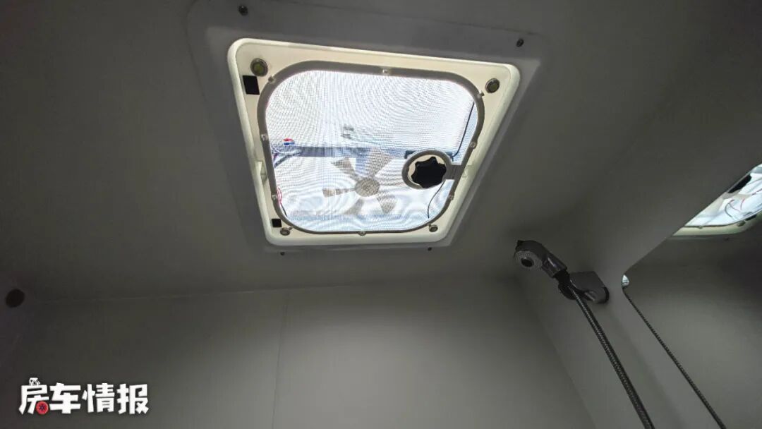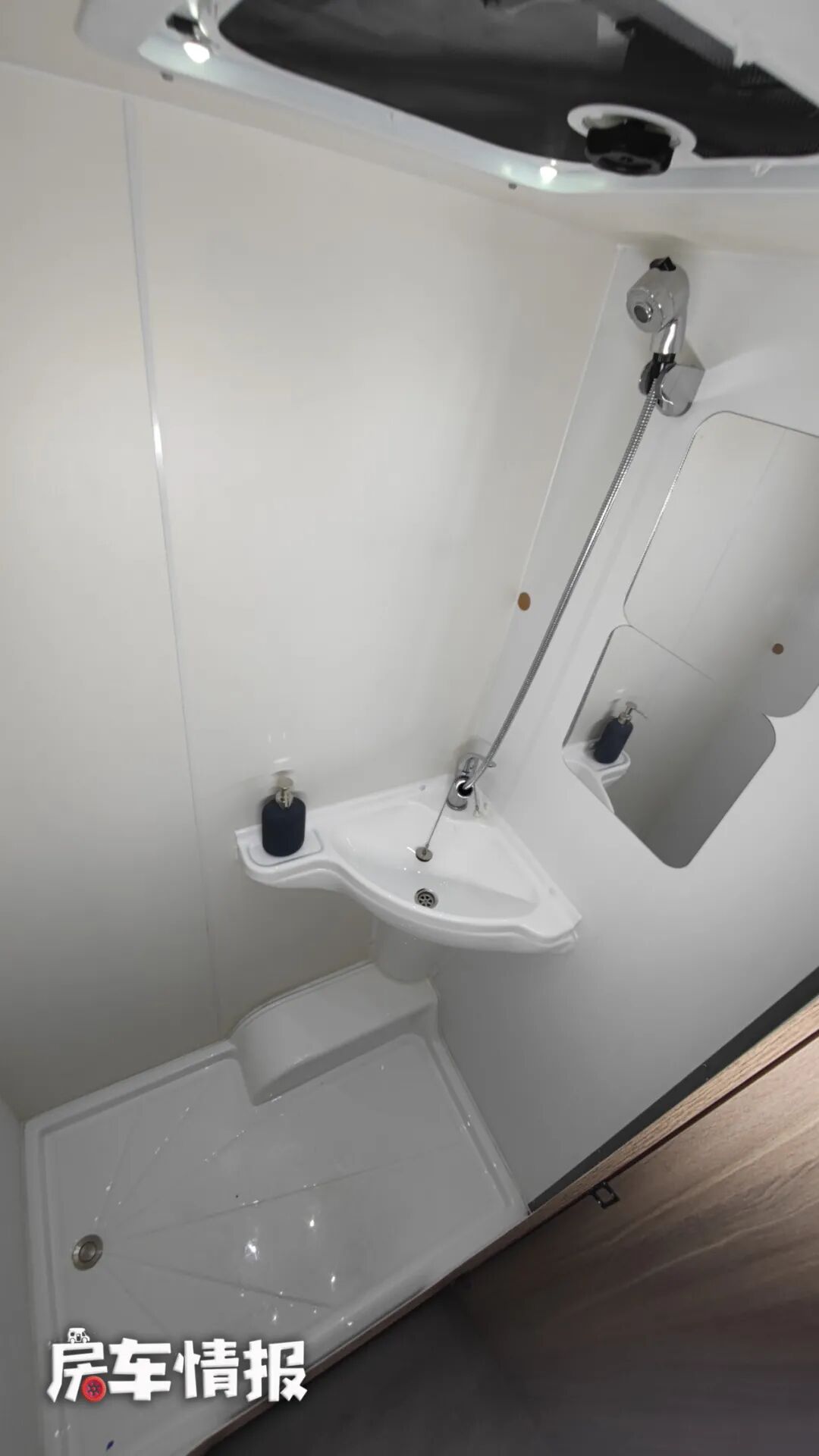 卫生间内部空间不大,采用防水玻璃钢底托,配有独立的淋浴喷头和换气扇,从图片中我们没看到马桶,其实为了充分利用内部空间这款车配备的是20L的便携式马桶,使用的时候拿进来即可。