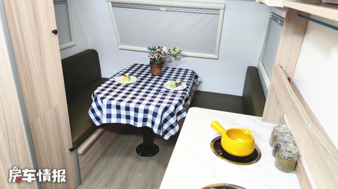 那么接下来咱们进入这款房车内部来一探究竟吧,车内很明显的分出了会客区、厨卫、以及卧室区。在车头一侧是对卡座区域,当驻车以后可以坐在这个位置喝茶、聊天。车辆在行驶过程中,拖挂房车内部是不能坐人的。