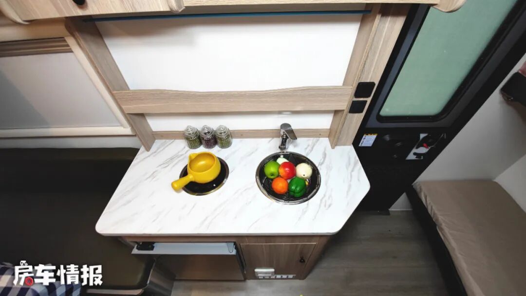 厨房位于车门一侧,操作台上方配有电磁炉和洗菜池,下方是一台苍浪49L冰箱可供日常使用。