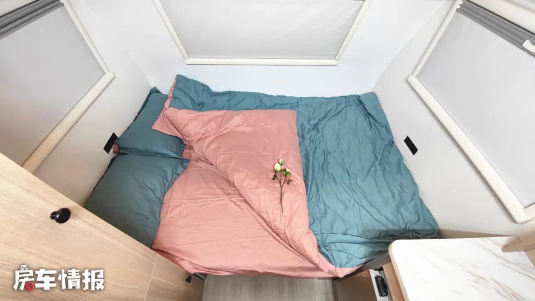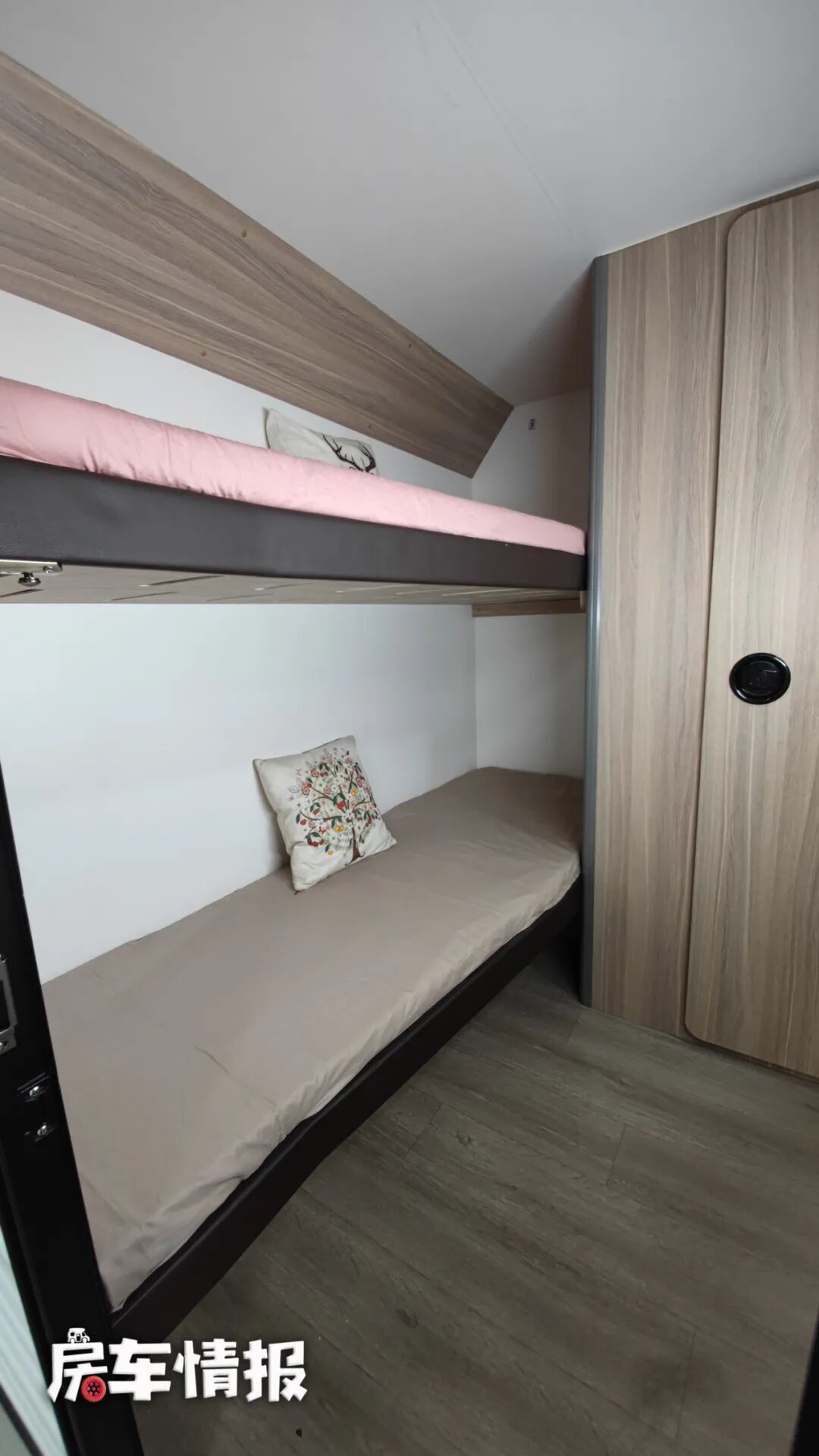 车尾采用的是上下床的形式,床铺略窄,可以保证两人的使用需求,这款拖挂房车内部总共可以保证4人同时休息。