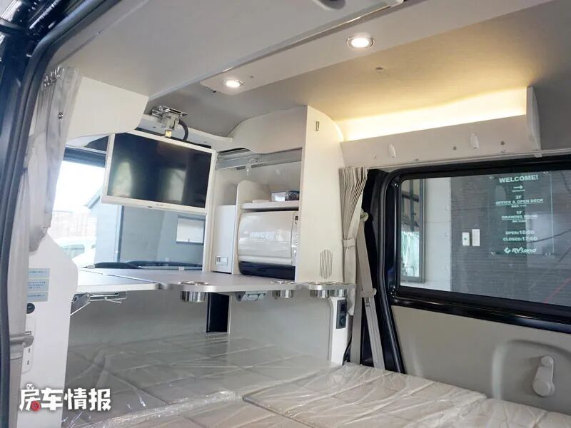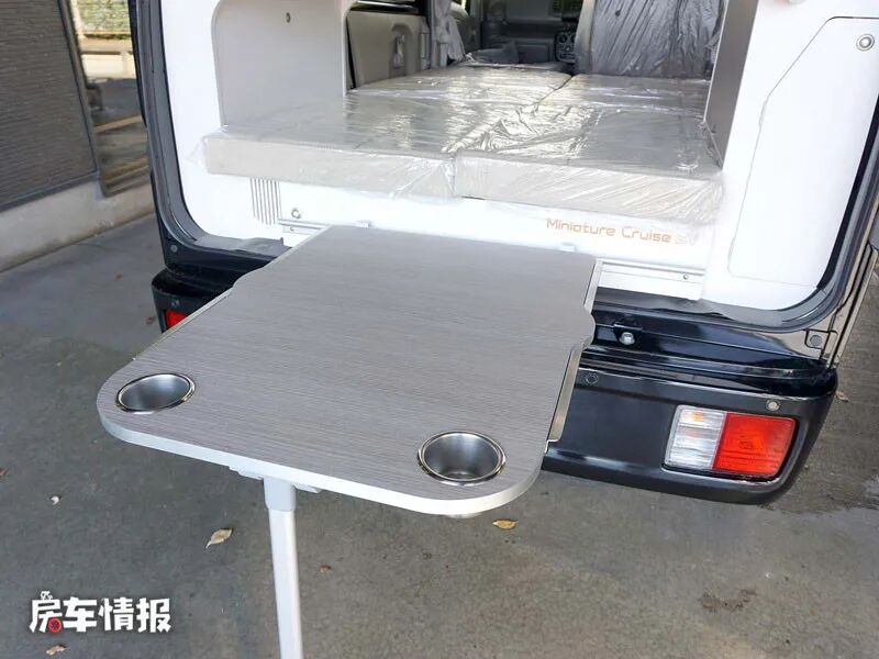 打开车尾门后,还可以将小桌板安装在这里,在车外用餐、休息。而且车尾顶部的19寸电视机即可以朝前,在车内观看,还可以转向后方,在车外观看,满足了不同的使用需求。